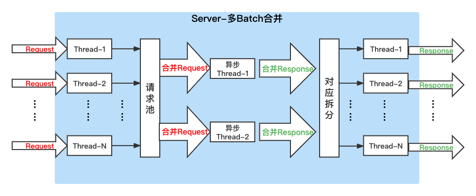动态合并Batch的原理如下图所示。当用户请求request并发量较大,但GPU利用率较小时,可以通过将不同用户的request组合为1个大的Batch进行模型预测,从而提高服务的吞吐性能。