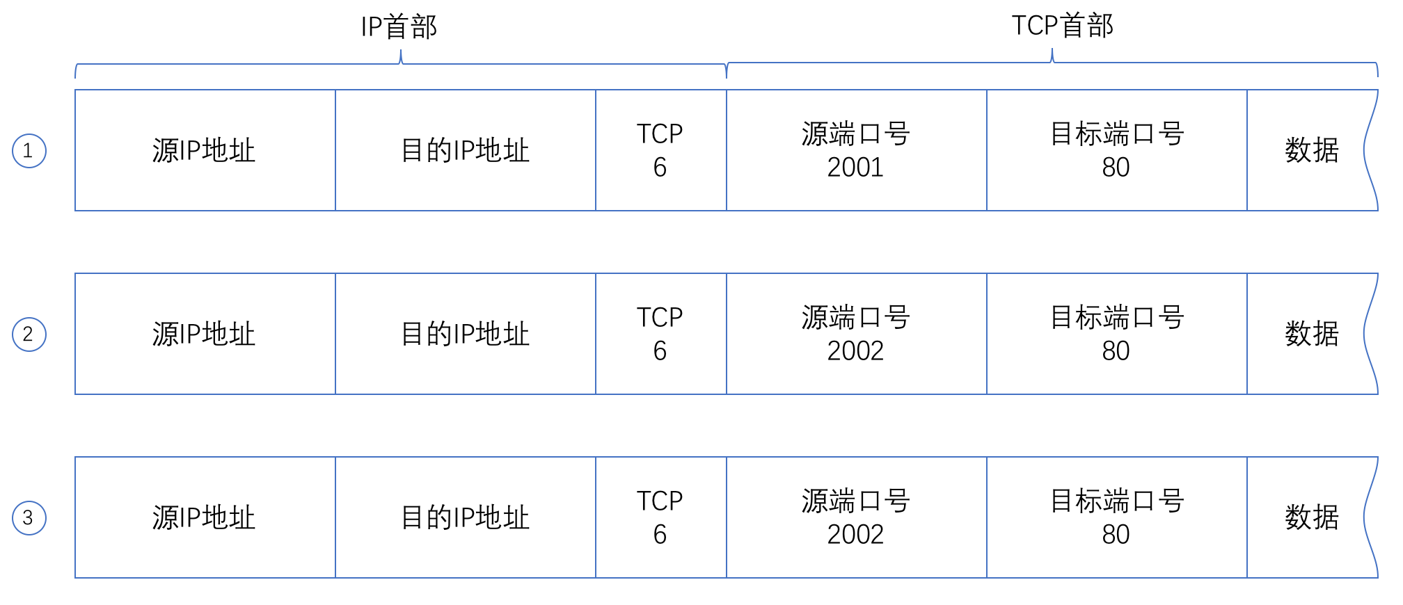 TCP 和 UDP 协议首部的前四个字节都是用来表示端口的,分别表示源端口和目的端口,各占 2 个字节,详细的 TCP、UDP 协议头部会在下面的文章中讲到。