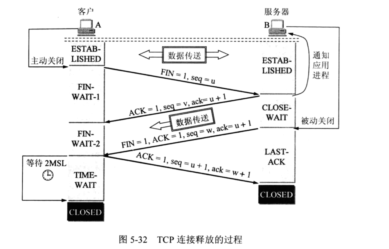 1)数据传输结束后,主机 A 的应用进程调用 Close 函数,先向其 TCP 发出释放连接请求,不再发送数据。TCP 通知对方要释放从主机 A 到主机 B 的连接,将发往主机 B 的 TCP 报文段首部的终止比特 FIN 置为 1,序号 seq1 等于已传送数据的最后一个字节的序号加 1。