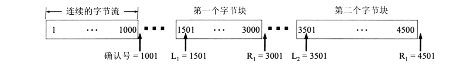 前面说了,sack 报告的是已接收的不连续的块,在这个例子中,sack 块的内容为 {Start:1501, End:3001},{Start:3501, End:4501}。